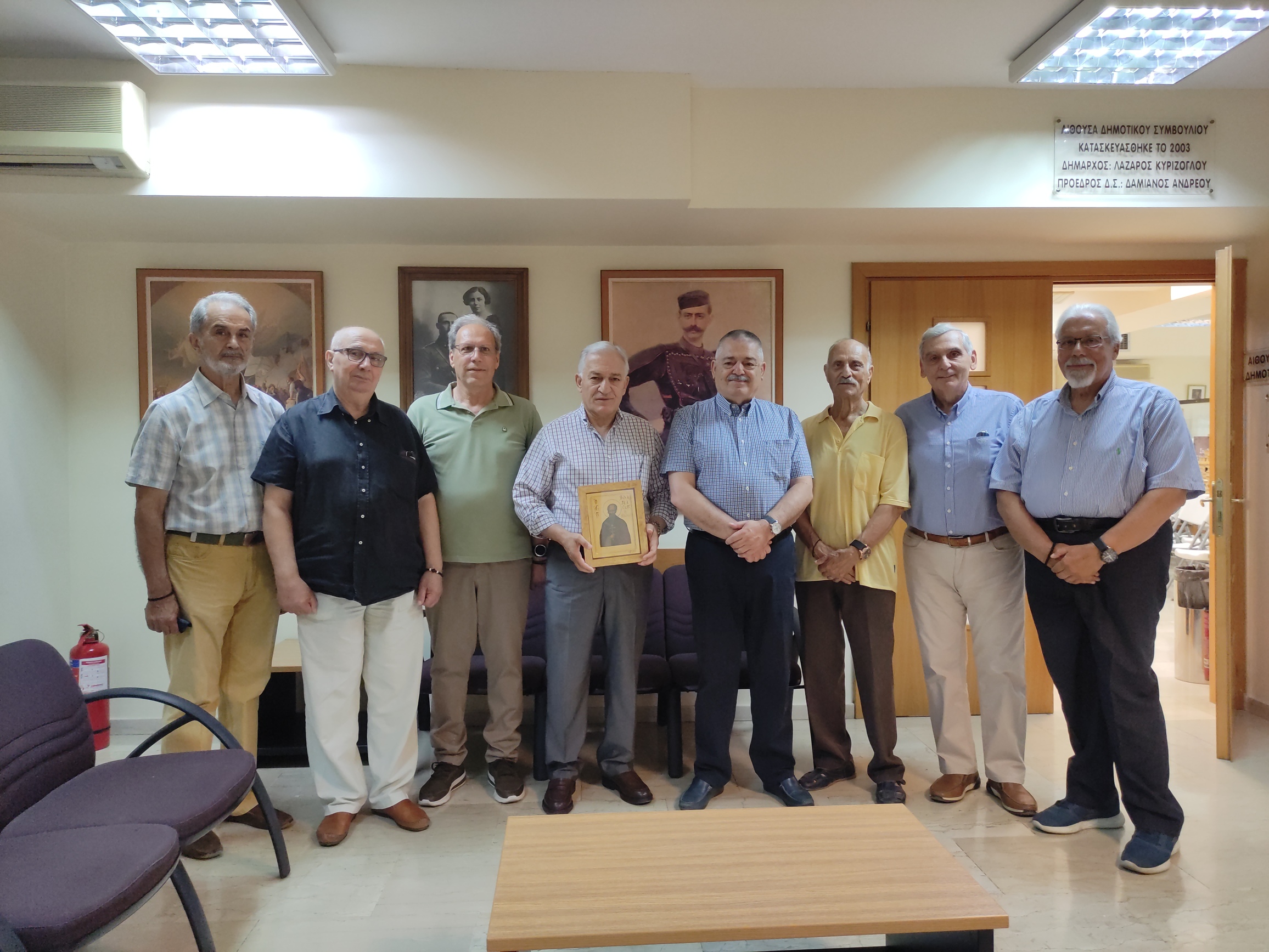 Μέλη του ΔΣ του Ομίλου μας επισκέφθηκαν σε προγραμματισμένη εθιμοτυπική επίσκεψη, στο Δημαρχείο Αμπελοκήπων – Μενεμένης, τον Δήμαρχο και Πρόεδρο της ΚΕΔΕ κ. Λάζαρο Κυρίζογλου. Η συνάντηση πραγματοποιήθηκε σε ιδιαίτερα εγκάρδιο κλίμα και ανταλλάχθησαν απόψεις για τη συνεργασία του Δήμου προς ενίσχυση του φιλανθρωπικού έργου του Ομίλου μας. Ο Δήμαρχος υποσχέθηκε την άμεση οικονομική και υλική ενίσχυση του Ομίλου με ότι μέσο έχει στη διάθεσή του. Παραδόθηκε στον Δήμαρχο εικόνα του Αγίου Αθανασίου του Αθωνίτη και Ιστορικός τόμος για την Μακεδονία της ΕΜΣ. Εκ μέρους του ΔΣ παρευρέθησαν οι: Αθανάσιος Κουτσιμανής ς, Αλέξανδρος Νικολαϊδης , Γεώργιος Πουρνάρης, Νικόλαος Παπαδόπουλος, Ιωάννης Σαράτσης, Παράσχος Παπαδάκης και Κωνσταντίνος Αγαθαγγέλου.