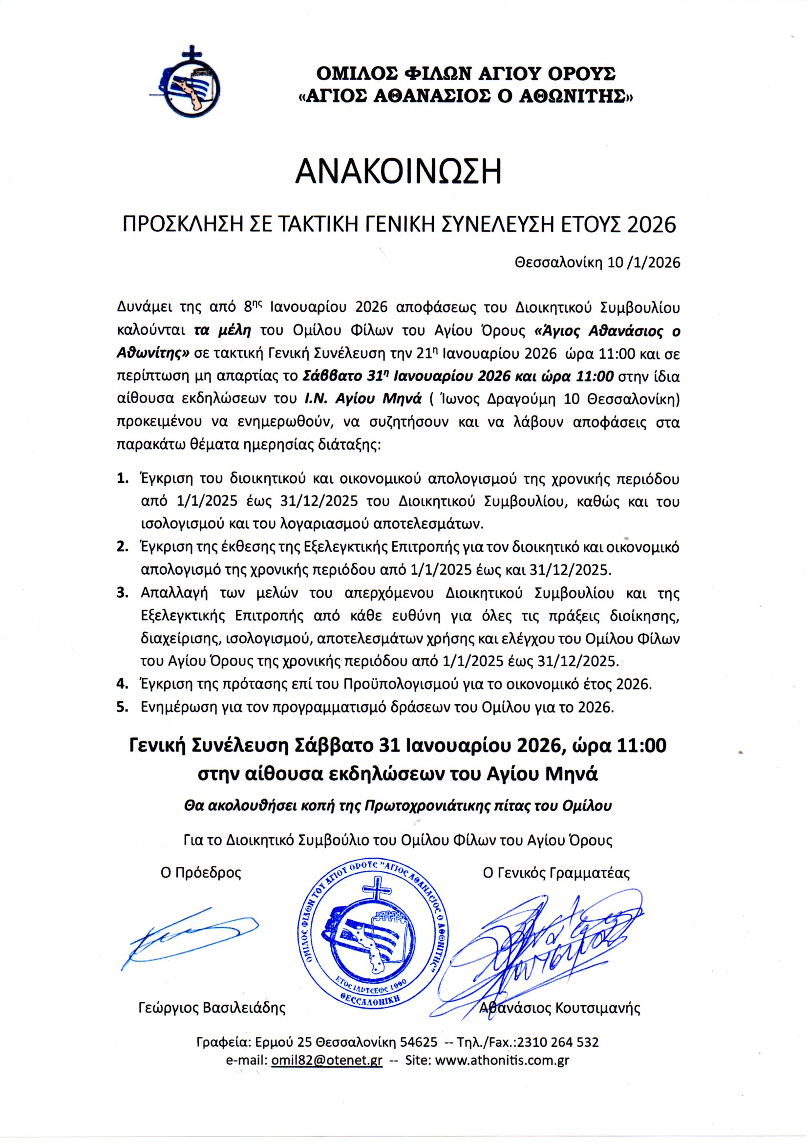 ΠΡΟΣΚΛΗΣΗ ΣΕ ΤΑΚΤΙΚΗ ΓΕΝΙΚΗ ΣΥΝΕΛΕΥΣΗ ΕΤΟΥΣ 2026